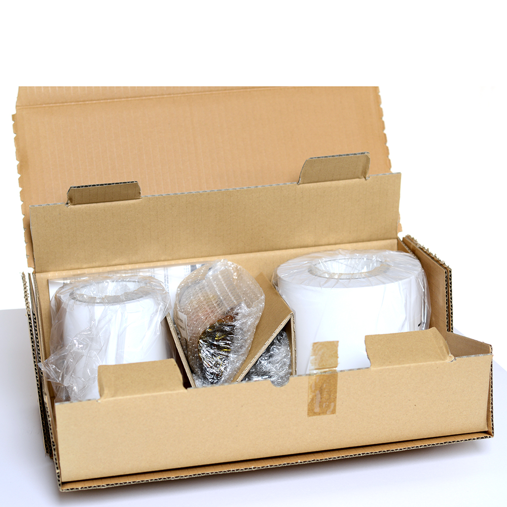 Öppnad förpackning med 1×600 ny rulle + färgband